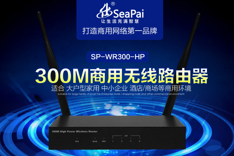 SeaPai仕牌SP-WR300-HP无线路由器是专为中小型企业用户而设计,采用11N无线标准,无线传输速率最高可达300Mbps,标配两根大功率高增益天线(5dBi),采用2X2 MIMO架构,能实现信号多路收发,大幅增强无线接收能力;其采用高性能硬件平台,专业的网络操作系统,集上网行为管理、网络安全管理、网络维护管理于一身,支持PPPoE Server、多协议VPN等功能,是一款中小型企业网络而设计的无线上网行为管理路由器。