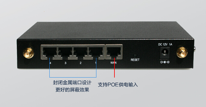 其默认提供1个10/100/1000M自适应WAN口,4个10/100/1000M自适应LAN口。其中WAN口支持802.3af标准POE供电,施工更方便,布线更简洁,布设更自由。