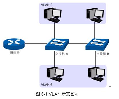 以太网是一种基于CSMA/CD(Carrier Sense Multiple Access/Collision Detect,载波侦听多路访问/冲突检测)的共享通讯介质的数据网络通讯技术,当主机数目较多时会导致冲突严重、广播泛滥、性能显著下降甚至使网络不可用等问题。通过交换机实现LAN互联虽然可以解决冲突(Collision)严重的问题,但仍然不能隔离广播报文。在这种情况下出现了VLAN(Virtual Local Area Network)技术,这种技术可以把一个LAN划分成多个逻辑的LAN——VLAN,每个VLAN是一个广播域,VLAN内的主机间通信就和在一个LAN内一样,而VLAN间则不能直接互通,这样,广播报文被限制在一个VLAN内。同一个VLAN内的主机通过传统的以太网通信方式进行报文的交互,而不同VLAN内的主机之间则需要通过路由器或三层交换机等网络层设备进行通信。如图所示。