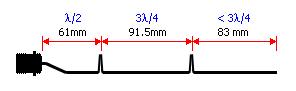 说明:底部是1/2波长,中部是3/4波长,顶部要稍微小于3/4波长,以便减少电容的影响。802.11b 标准使用2.412MHz ~ 2.484MHz频率范围,其中心频率的1/2波长是61mm,3/4波长是91.5m